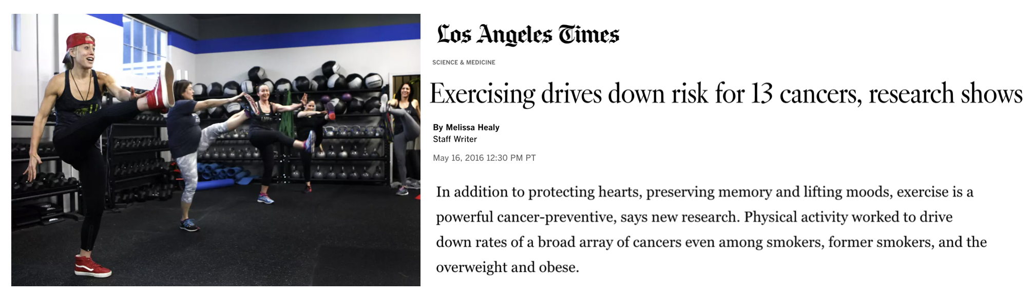 Moore, Steven C., et al. “Association of leisure-time physical activity with risk of 26 types of cancer in 1.44 million adults.” JAMA internal medicine 176.6 (2016): 816-825.
