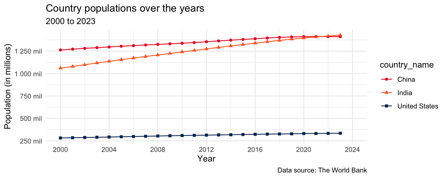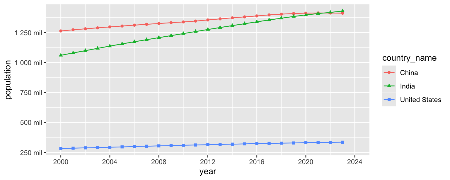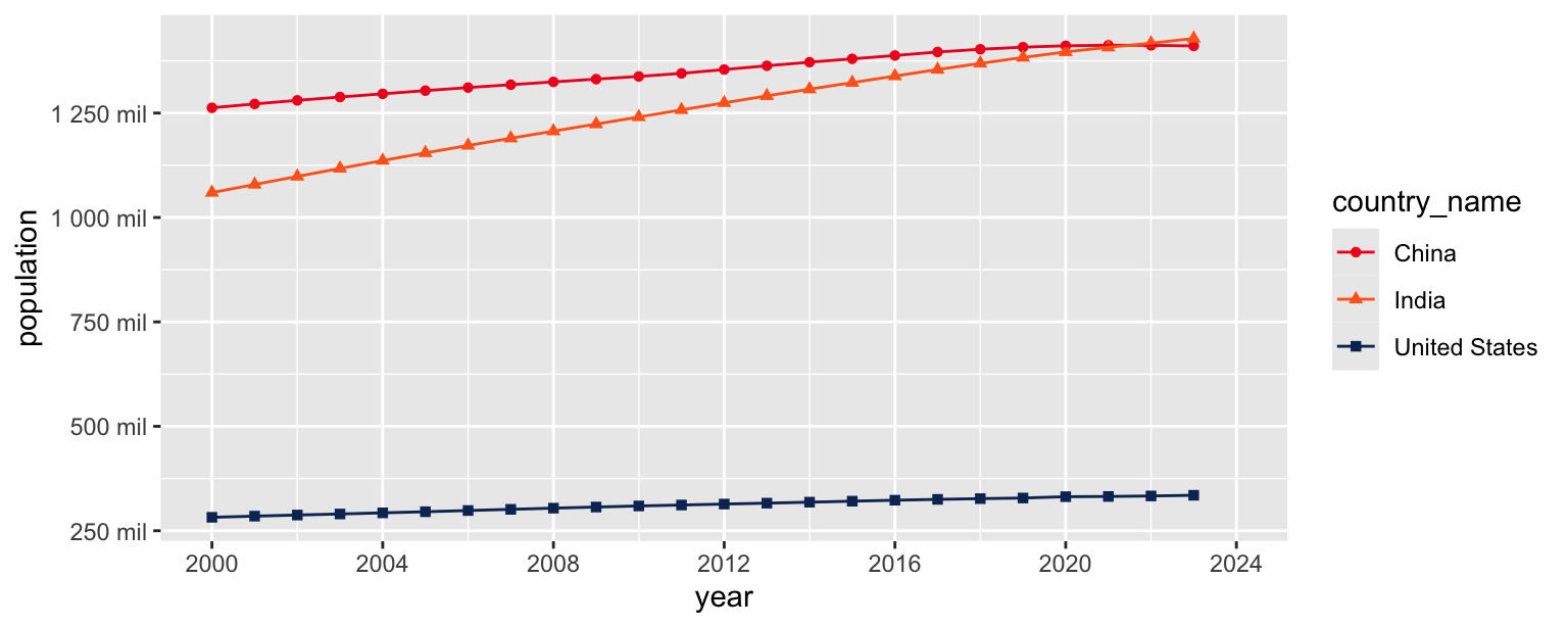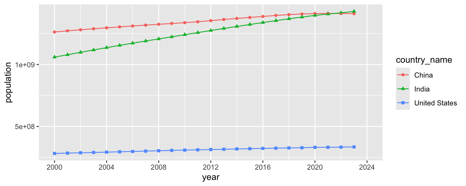ggplot(aes(x = year, y = population, color = country_name, shape = country_name)) +