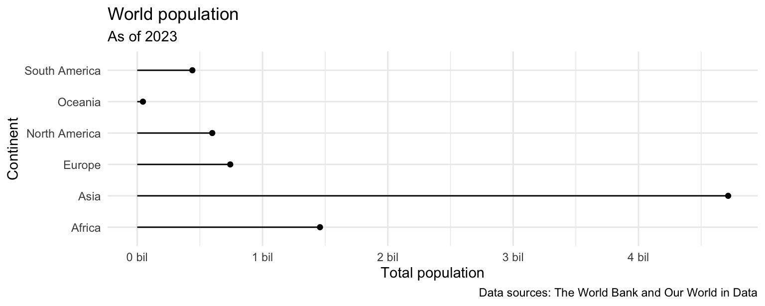Our ultimate goal in this application exercise is to create a bar plot of total populations of continents, where the input data are: