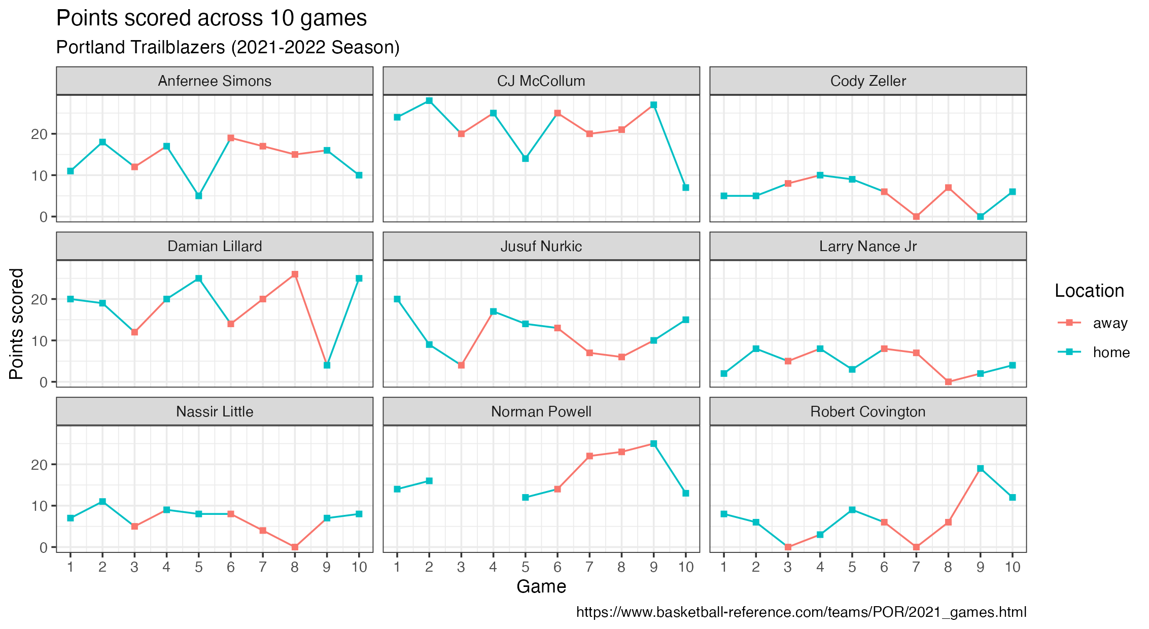 Variables in the above plot include player, game, location, and points. This plot can not be recreated with how the blazer dataset is currently formatted.