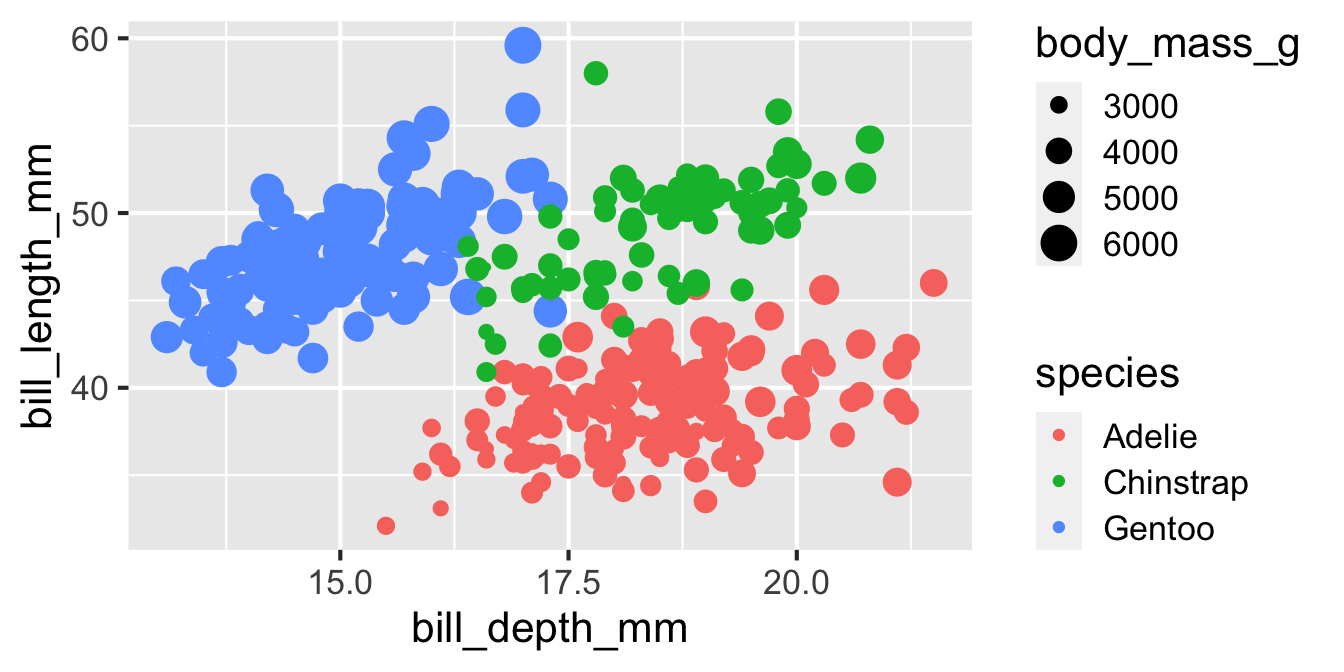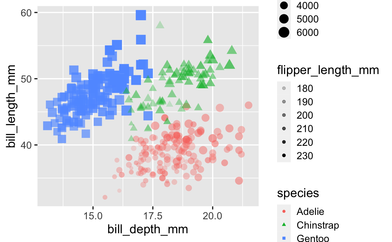 colorshapesizealpha (transparency)The color aesthetic mapped to species: