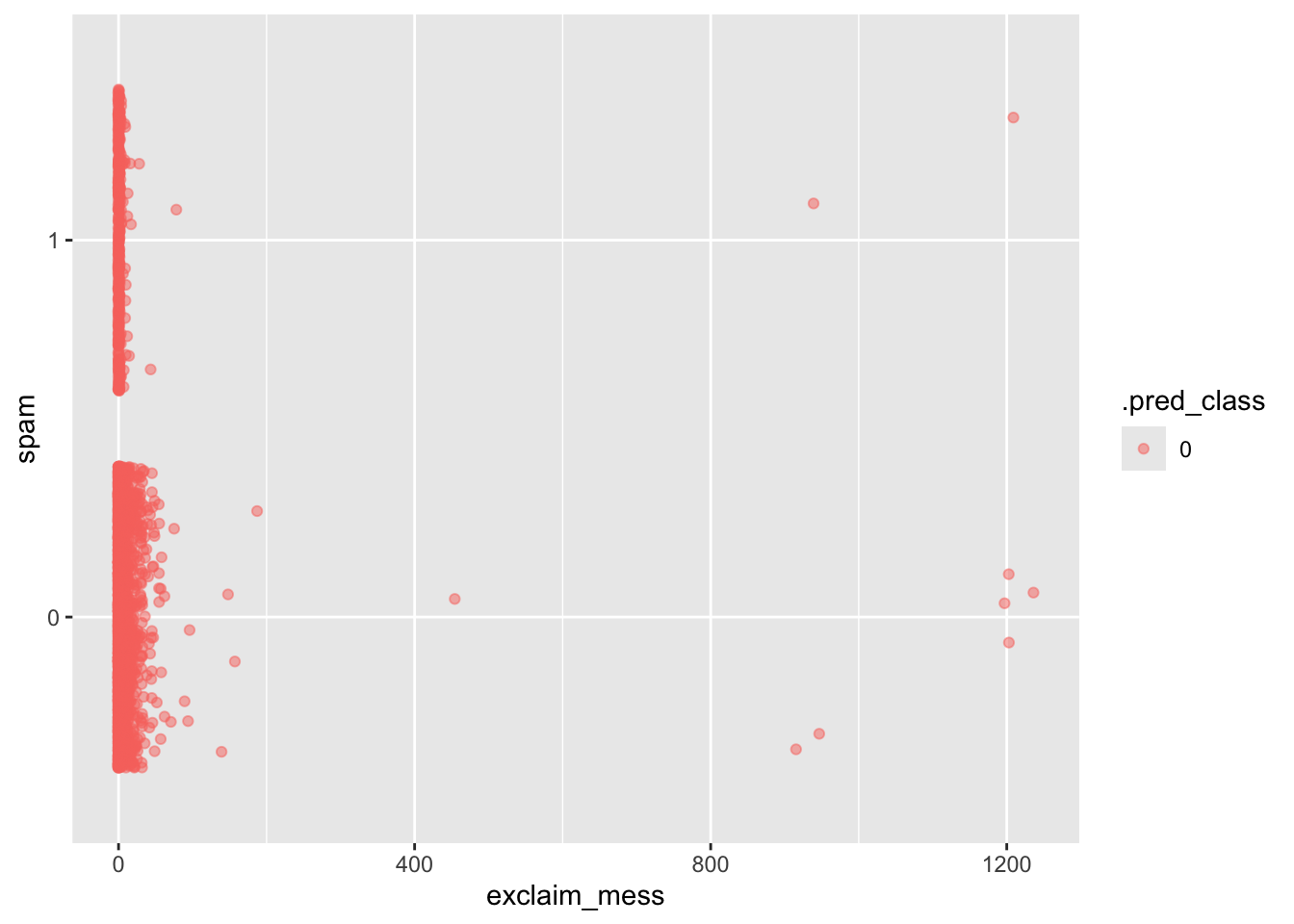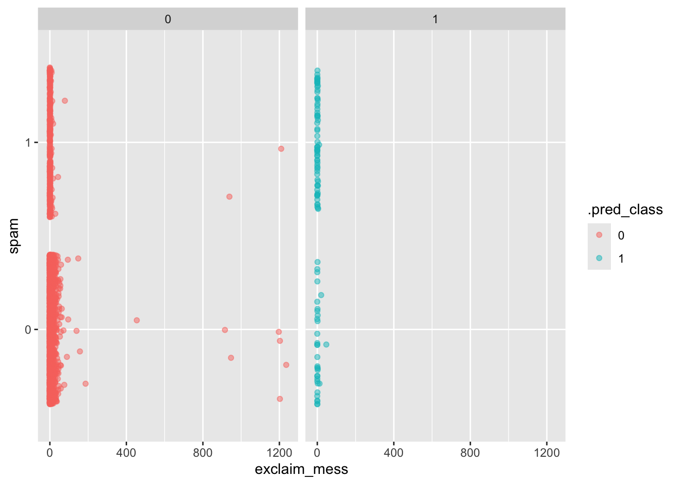 ggplot(log_aug2, aes(x = exclaim_mess, y = spam, color = .pred_class)) +