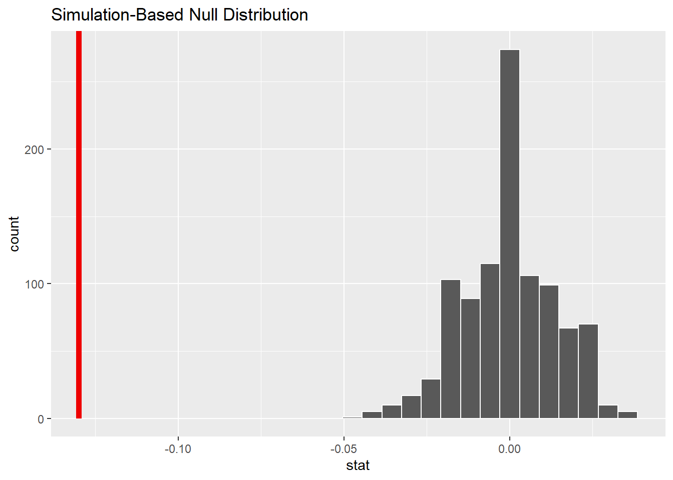 function is our statistic. The original statistic we calculated (-.13). Lastly, we need to specify the direction we shade from our statistic. This function will take the arguments “less”, “left”, “greater”, “right”, “two-sided”, “both”, “two_sided”, “two sided”, or “two.sided”.