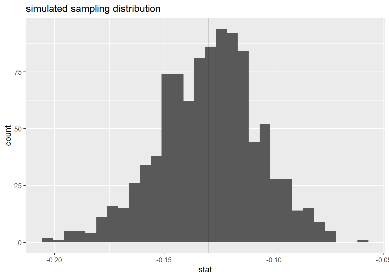 We can see that our simulated sampling distribution is centered right at -.13, our sample statistic.