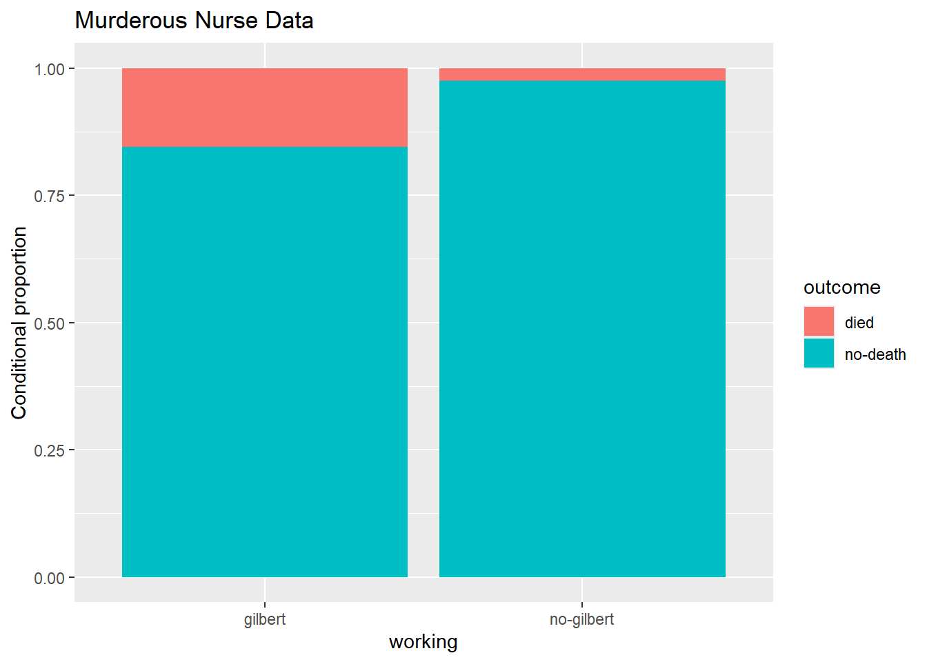 In words, this is the true proportion of patients who died during shifts where Gilbert was not working is lower than when she was working.