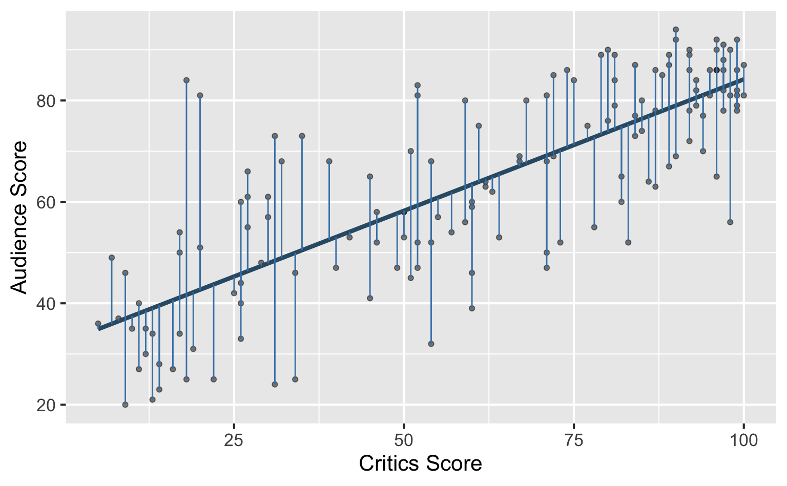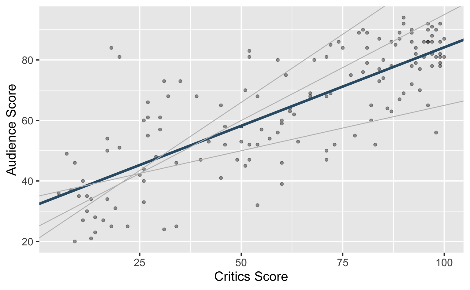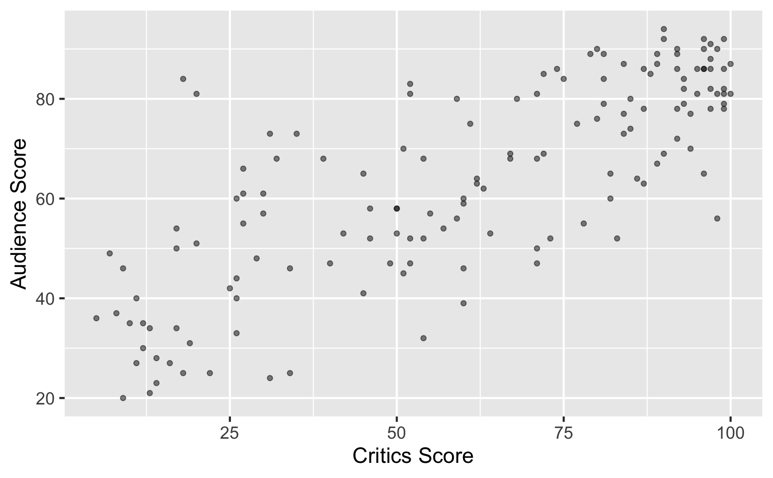 \[ \widehat{\text{audience}} = 32.3 + 0.519 \times \text{critics} \]