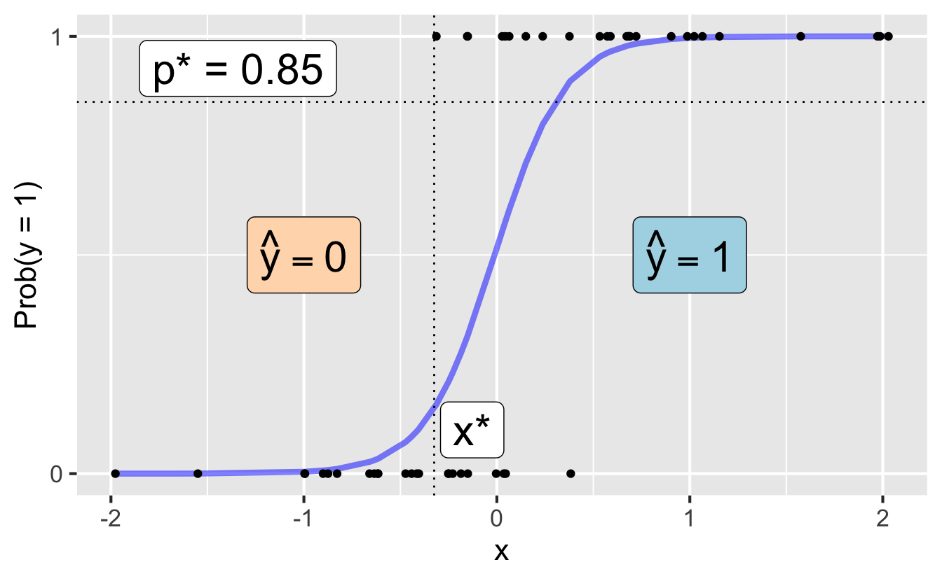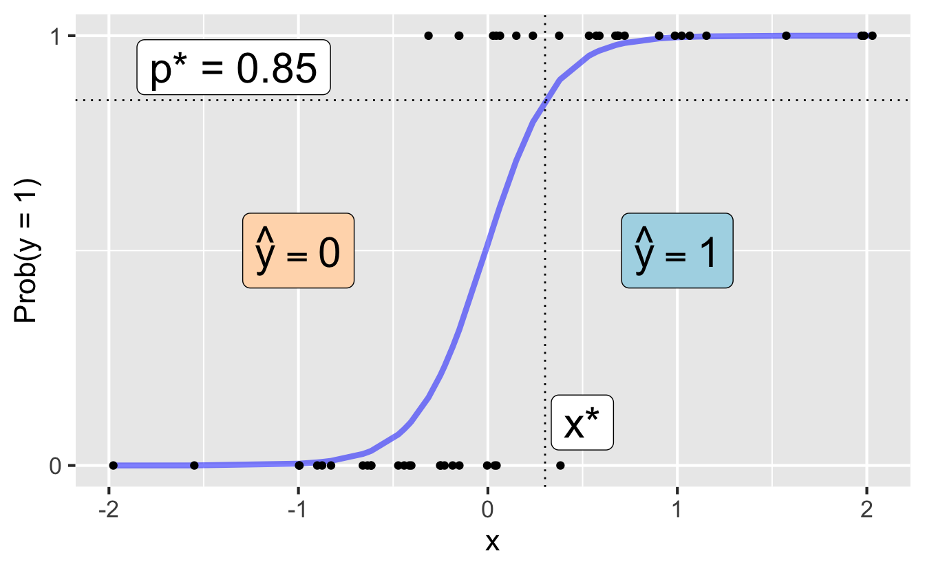 If we can model the relationship between predictors (\(x\)) and a binary outcome (\(y\)), we can use the model to do a special kind of prediction called classification.