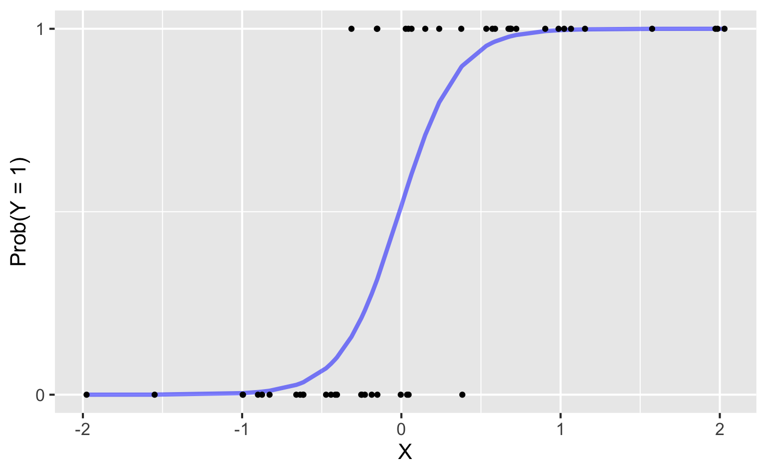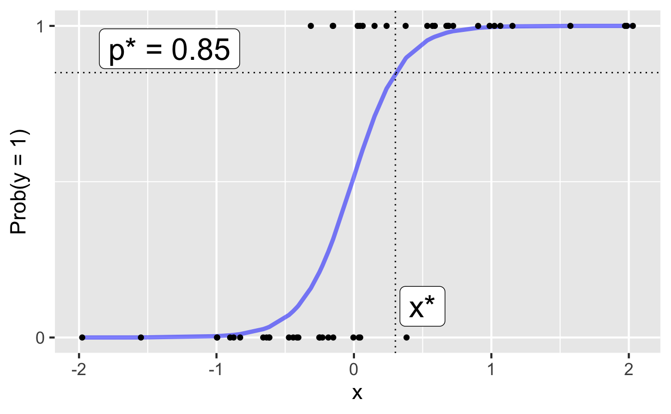 \[ \text{Prob}(y = 1) = \frac{e^{\beta_0+\beta_1x}}{1+e^{\beta_0+\beta_1x}}. \]