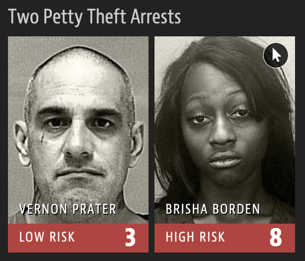 \[ y = \begin{cases} 1 & \text{suspect is at risk of re-offending pre-trial}\\ 0 & \text{suspect is safe} \end{cases} \]