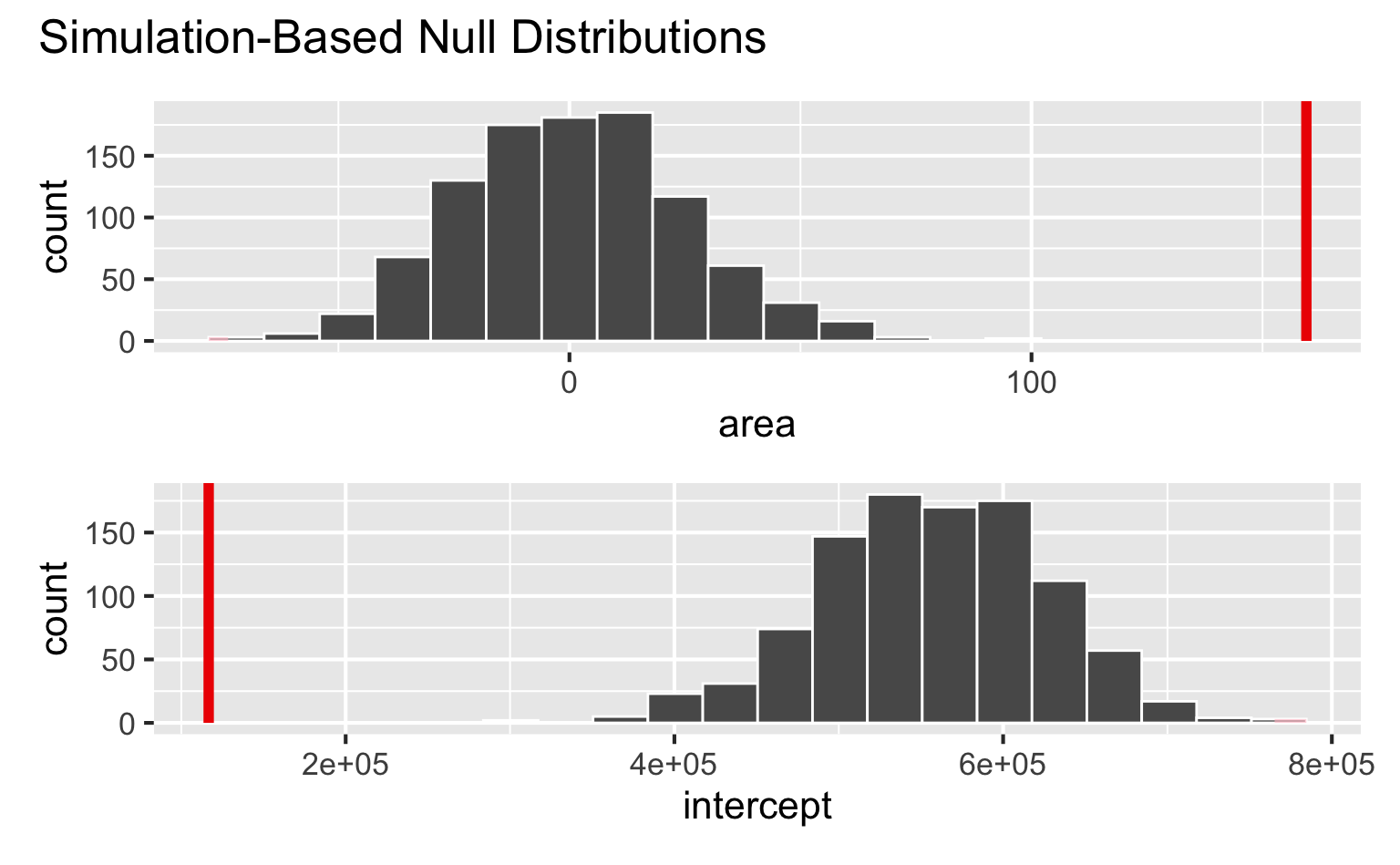 Null hypothesis, \(H_0\): “There is nothing going on.” The slope of the model for predicting the prices of houses in Duke Forest from their areas is 0, \(\beta_1 = 0\).